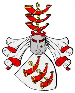 - Das Stammwappen zeigt in Silber drei rote, gold beschlagene und beschnürte Hifthörner übereinander. Auf dem Helm mit rot-silbernen Decken die drei Hifthörner übereinander.