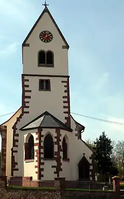 Hinter der protestantischen Kirche schließt sich ein aufgelassenes Gräberfeld an mit einigen für die evangelischen Gemeinden des unteren Elsass so typischen Grabstelen aus Sandstein. Anders als die Grabsteine auf katholischen Friedhöfen hat man hier auf Kreuzaufsätze oder Kreuzessymbole verzichtet. Die Grabstelen erinnern vielmehr an kurze Baumstämme, klassische Säulen oder Pylone, teilweise weist das Steinmetzdekor Pflanzenornamente und Stoffnachbildungen auf.