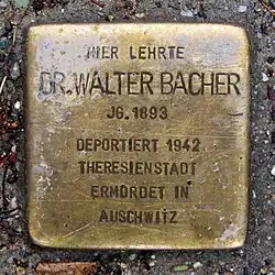1933 wurde er aus dem Staatsdienst entlassen. Er beteiligte sich am sozialdemokratischen Widerstand in Hamburg und hatte Kontakt zu einer Widerstandsgruppe, die antifaschistische Flugblätter verfasste und gefährdeten Personen die Flucht nach Dänemark ermöglichte. Selbst zu emigrieren, lehnte er ab, spätere Bemühungen, aus Deutschland herauszukommen, scheiterten. Um weiterhin die Möglichkeit zu haben, im antifaschistischen Sinn zu unterrichten, war er ab 1935 zunächst aushilfsweise an der Hamburger Talmud Tora Schule beschäftigt. Er trat 1935 in die Jüdische Gemeinde Hamburg ein. 1938 erhielt er eine Festanstellung. „In den letzten Jahren der jüdischen Schule in Hamburg gehörte Bacher zu den wenigen Lehrern mit akademischer Ausbildung, die nicht emigriert waren. Er nahm bis zuletzt unter bedrückendsten Verhältnissen eine außerordentliche Arbeitslast auf sich, um einen qualifizierten wissenschaftlichen Unterricht in der Oberstufe zu ermöglichen.“[1] Im Frühsommer 1942 musste Bacher mit seiner Familie in ein „Judenhaus“ umziehen und am 19. Juli 1942 wurden sie ins Ghetto Theresienstadt deportiert. Von dort gingen sie am 29. September 1944 auf einen Transport in das Vernichtungslager Auschwitz-Birkenau.