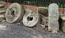 Zwei alte Mühlsteine und ein Grenzstein an der Mittelmühle. Der Abbau und die Verarbeitung von Sandstein zu Mühlsteinen erfolgte in Waltersdorf seit dem 16. Jahrhundert.