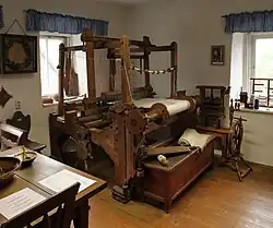 Historischer Webstuhl im Volkskunde- und Mühlenmuseum Mittelmühle. Die Leinenweberei und später die Jacquardweberei bestimmten seit dem 17. Jahrhundert die Wirtschaftsentwicklung des Dorfes.