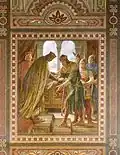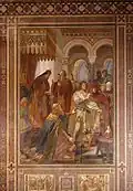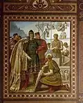 ![]() Barbarossas Fußfall vor Heinrich dem Löwen in Chiavenna (1176); darunter Grisaillen: Barbarossa beim Hoftag von Besançon (1157); Heinrich der Löwe unterwirft sich Barbarossa in Erfurt (1181) |