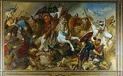 ![]() Barbarossas Sieg bei Ikonium (1190); darunter Grisaillen: Barbarossa trifft seinen Sohn Friedrich nach der Schlacht bei Ikonium (1190); Tod Barbarossas auf dem Kreuzzug (1190) |