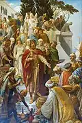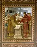![]() Kaiserkrönung Heinrichs II. in Rom (1014); darunter Grisaillen: Krönung Heinrichs II. zum König von Italien in Pavia (1004); Wahl Konrads II. in Kamba (1024) |