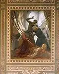 ![]() Barbarossa erwacht und blickt zu Kaiser Wilhelm – die Raben verschwinden; darunter Grisaille: Am Sterbebett der Königin Luise (1810); über der Tür: Kaiser Wilhelm besucht die Pfalz Goslar (1875) |