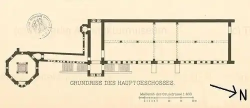 Der Saal umfasst nahezu das gesamte erste Stockwerk des zweigeschossigen, von Nordnordwest nach Südsüdost gestreckten Pfalzgebäudes. Er ist 47 m lang und 16 m breit[5] und durch Holzpfeiler in ein Mitteljoch mit hölzernem Quertonnengewölbe und je drei Seitenjoche mit flacher Balkendecke gegliedert. Die Ostwand enthält 18 Rundbogenfenster, der zentrale Schaugiebel zur einstigen Stiftskirche St. Simon und Judas weitere sechs. Bei der Ausmalung legten sich damit von selbst ein großes Zentralbild an der Westwand des Mitteljochs und mehrere Ebenen von großen und kleinen Erzählbildern an den übrigen westlichen Wandflächen sowie den schmalen Nord- und Südseiten nahe.