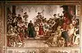 Das Gemälde ist als Triptychon nach Art eines Altarretabels konzipiert. Die seitlichen Felder sind vom Hauptbild durch gemalte Säulen abgegrenzt, die bekrönende Rundbögen tragen. Auch die Zone darüber bis unter das Gewölbe ist ausgemalt.