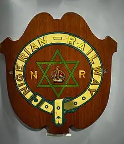 Die Nigerian Railways verwendeten das damals offizielle Emblem des britisch-kolonialen Nigeria, ein grünes Hexagramm oder Salomonssiegel, das die kaiserliche Staatskrone enthielt. Umrahmt mit ihrem Namen in einem Band mit Schnalle.[5][6]