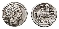 - 8. Feld: Das Wappen von Huesca mit dem Reiter auf dem Schimmel und der Inschrift V.V. OSCA erscheint erstmals zwischen 1587 und 1595[13]. Es greift Elemente auf, die bereits auf römischen Münzen, die zwischen 150 und 100 vor Christus in Huesca geprägt wurden, erschienen. Seit der Inbesitznahme der vorher Bolskan genannten Stadt für Rom durch Aulus Terentius Varro 179 v. Chr. lautete ihr Name VRBS VICTRIX OSCA. Dazu kommt die goldene Kerbe, die aus dem Vorgängerwappen des 13. Jahrhunderts auf rotem Grund stammt. Sie steht für den Salto de Roldán („Rolandssprung“), ca. 25 km nördlich von Huesca. Hier soll der sagenhafte Roland, ein Ritter des fränkischen Heeres seinen maurischen Verfolgern durch einen Sprung zwischen den beiden etwa 1.100 m hohen Felsen entkommen sein[14]. Die Schildfarbe des heutigen Stadtwappens ist Blau mit rotem Rand.