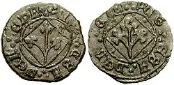 Aragonesische Pugesas des 14. Jahrhunderts - 2. Feld: Fraga wurde am 24. September 1149 von Ramón Berengar IV., Graf von Barcelona und Gatte der Erbin von Aragón, Petronella, vom maurischen Regenten Muhammad Ibn Mardanís erobert. Deshalb nimmt das Wappen Ramón Berengars die rechte Hälfte des Wappens von Fraga ein. Die linke Hälfte wurde seit 1344 von einer grünen, sich in drei Blätter verzweigenden Pflanze eingenommen, die auch auf hier geprägten aragonesischen Münzen (pugesas) erschien. Von späteren Bürgermeistern wurde dieses Symbol, das wohl für zu geringwertig erachtet wurde, durch einen entwurzelten Olivenbaum ersetzt[4]. Das Schildchen mit der Lilie aus dem Wappen des Hauses Bourbon wurde 1710 von König Philipp V. verliehen in Anerkennung der Treue Fragas im Spanischen Erbfolgekrieg[5].
