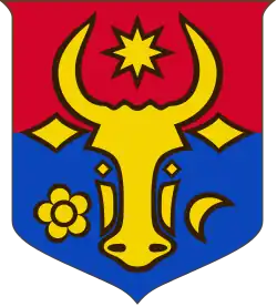Darüber liegt der goldene Kopf eines Auerochsen, zwischen dessen Hörnern sich ein achtstrahliger goldener Stern befindet.