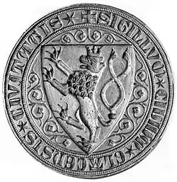 Blasonierung = Im roten Schilde der aufgerichtete, doppelgeschwänzte und goldgekrönte silberne Löwe des Königreichs Böhmen.