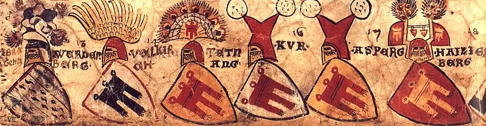 - Große Heidelberger Liederhandschrift (Codex Manesse), Ende 13. bis Anfang 14. Jahrhundert, Porttraitdarstellungen mit zahlreichen Wappen und Helmzierden.