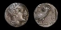 Das letzte Motiv, das vor der Einheitsmünze auf die Vorderseite geprägt wurde, war das Gorgoneion. Parallel zu diesem Motiv erschien auch eine Neuerung in der Art der Herstellung. Auf der Rückseite des Gorgoneion ist ein quadratum incusum mit einem Löwenkopf von vorne mit zwei Tatzen abgebildet. Dies ist der erste Hinweis für ein Rückseitenmotiv bei den attischen Münzen. Für die Wahl des Löwenkopfes als Motiv gibt es allerdings keine plausible Erklärung.