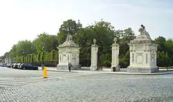 Blick vom Gebäude des Parlaments auf Nordeingang und Großen Springbrunnen des Parks