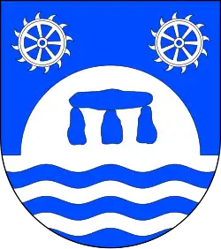 Blasonierung: „Über blau-silbernen Wellen in Blau ein mit einem blauen Steingrab belegter silberner Hügel. In den Oberecken jeweils ein siebenspeichiges silbernes Mühlrad.“[4]