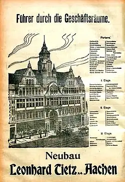Nachdem der aus der Provinz Posen stammende jüdische Kaufmann Leonhard Tietz im Jahr 1879 ein erstes großes Textilgeschäft in Stralsund eingerichtet hatte, startete er eine rasche Expansion seiner Geschäftsidee, indem er in mehreren Städten Deutschlands, vor allem im Rheinland, große Mehrsparten-Warenhäuser nach französischem Vorbild erbauen und/oder einrichten ließ. So entstanden im Rheinland Ende des 19. bis Anfang des 20. Jahrhunderts in Elberfeld das Kaufhaus Tietz Herzogstraße, in Köln das Warenhaus Hohe Straße, in Düsseldorf die Warenhäuser Tietz Schadowstraße und Tietz Heinrichsallee sowie am Rande des Aachener Marktes das Warenhaus Tietz Aachen.