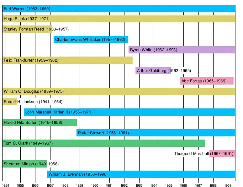Jackson starb 1954 und Minton ging 1956 in den Ruhestand, und sie wurden durch John Marshall Harlan II und William Brennan ersetzt. Eine weitere Vakanz fand statt, als Reed 1957 in den Ruhestand ging und durch Charles Evans Whittaker ersetzt wurde, und dann ging Burton 1958 in den Ruhestand, wobei Eisenhower Potter Stewart an seiner Stelle ernannte. Als Frankfurter und Whittaker 1962 in den Ruhestand gingen, erhielt der damalige Präsident John F. Kennedy die Befugnis, zwei neue Richter zu ernennen: Byron White und Arthur Goldberg. Präsident Lyndon B. Johnson ermutigte Goldberg jedoch, 1965 zurückzutreten, um Botschafter bei den Vereinten Nationen zu werden, und ernannte Abe Fortas, um seinen Platz einzunehmen. Clark trat 1967 in den Ruhestand, und Johnson berief den ersten afroamerikanischen Richter, Thurgood Marshall, zum Gericht. Das Warren-Gericht endete am 23. Juni 1969, als Earl Warren in den Ruhestand ging und durch Warren E. Burger ersetzt wurde.