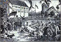 Anlässlich des 4. Jahrestages der Völkerschlacht bei Leipzig am 18. Oktober 1817 und des bevorstehenden 300. Jahrestages des Beginns der Reformation trafen sich Studenten beinahe aller evangelischen deutschen Universitäten auf der Wartburg im Großherzogtum Sachsen-Weimar-Eisenach in Thüringen. Die Versammlung der ca. 500 Studenten[1] und einiger Professoren war eine Protestkundgebung gegen reaktionäre Politik und Kleinstaaterei und für einen Nationalstaat mit einer eigenen Verfassung. Als Zufluchtsort Martin Luthers 1521/22 galt die Wartburg als deutsches Nationalsymbol.