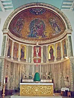 Neben dem Hochaltar im Chor ist auf der Südseite ein Marienaltar mit Immakulata und Stipes-Mosaik von John Francis Bentley vorhanden (um 1875); an der Nordwand steht ein St. Gregor dem Großen geweihter Marmoraltar aus dem frühen 19. Jahrhundert. Nördlich neben der Apsis befindet sich eine Tür zur Sakristei und zum mit der Kirche verbundenen ehemaligen Gesandtschaftsgebäude Golden Square Nr. 24. Über dieser Tür wurde ein Stuckrelief der Himmelfahrt Mariens von John Edward Carew († 1868) platziert, das vor dem Bau der Apsis als Retabel des Hochaltars diente.