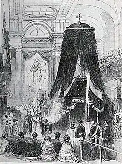 Schon um 1850 war über dem Hochaltar ein Stuckrelief der Himmelfahrt Mariens angebracht worden, wonach die Kirche seit 1854 mit diesem Zusatzpatrozinium erscheint. 1853 zelebrierte der aus London stammende Missionsbischof William Placid Morris (1794–1872) hier ein feierliches Requiem für die verstorbene Königin Maria II. von Portugal. Davon ist eine Zeichnung erhalten, auf der man das Aussehen des Altarraumes mit diesem Stuckrelief erkennen kann.