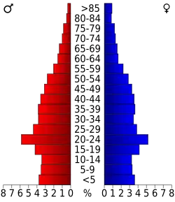 25,0 Prozent der Bevölkerung waren unter 18 Jahre alt, 15,3 Prozent zwischen 18 und 24, 30,2 Prozent zwischen 25 und 44, 19,5 Prozent zwischen 45 und 64 und 9,9 Prozent waren 65 Jahre oder älter. Das Durchschnittsalter betrug 31 Jahre. Auf 100 weibliche kamen statistisch 100,4 männliche Personen und auf 100 Frauen im Alter von 18 Jahren und darüber kamen durchschnittlich 98,7 Männer.