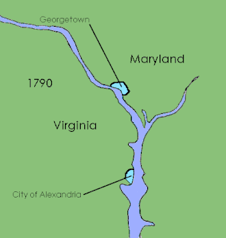 1791 wurde das Gebiet des District of Columbia aus den Staaten Maryland und Virginia herausgenommen. Es ist beiderseits des Potomac gelegen und war ursprünglich ein Quadrat mit einer Seitenlänge von genau 10 Meilen, also etwa 16,1 Kilometern. Die Lage kam durch einen Handel von Thomas Jefferson, der aus Virginia stammte, mit Alexander Hamilton, dessen Heimat New York City ursprünglich Sitz der Regierung war, zustande: Jefferson unterstützte Hamiltons Pläne einer Nationalbank, dafür stimmte dieser einer in den Südstaaten gelegenen Hauptstadt zu.