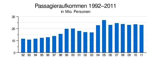 | Jahr | Fluggastaufkommen | Luftfracht (Tonnen) | Luftpost (Tonnen) | Flugbewegungen | |||