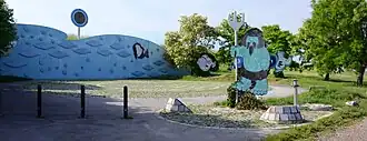 Mit der künstlerischen Ausgestaltung des Behälters Bisamberg, der als erster und einziger Wasserbehälter der Wiener Wasserwerke nicht eingezäunt und daher frei zugänglich ist, wurde der Künstler Gottfried Kumpf beauftragt.[5] Die von der Brünner Straße aus sichtbare wellenförmig geschwungene Fassade des Behälters besteht aus blau eingefärbtem Beton und ist gemeinsam mit dem Vorplatz mit aus emailliertem Stahl gefertigten Figuren von Fischen, Nixen und einem Wassermann geschmückt. Auch die Lieblingsfigur von Gottfried Kumpf, der Asoziale, ist vertreten.