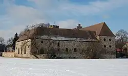 Östlich grenzt ein Gebäude aus unverputztem Bruchstein dem Giebel des Wohnflügels an. Es ist zweistöckig. Die Fenster im unteren Stockwerk sind in der nördlichen Außenwand rundbogig. Die Einfassungen sind mit Ziegelsteinen ummauert, was darauf hinweist, dass es sich um nachträglich eingelassene Öffnungen im Mauerwerk handelt. Die obere Reihe Fenster wurde nach außen vollständig zugesetzt. Nach Osten wurden vier Ochsenaugen in das Mauerwerk eingearbeitet. Auch diese sind mit Ziegeln ummauert. Das Dach ist fensterlos und nach Osten abgewalmt. Das Gebäude wurde zuletzt als Wirtschaftsgebäude genutzt, war jedoch in früheren Jahrhunderten einmal ein Wohnflügel gewesen.