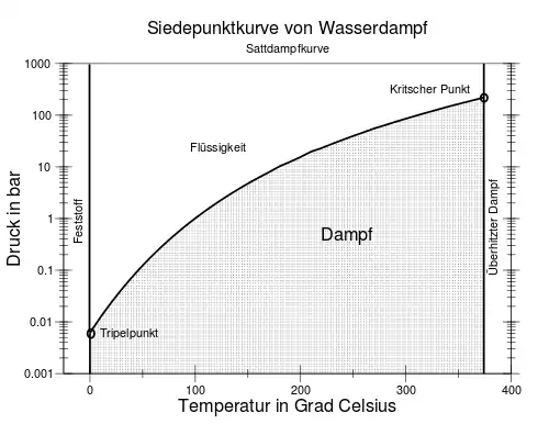 Der Dampfdruck des Wassers ist temperaturabhängig. Bei Temperaturen unterhalb des Siedepunktes spricht man von Verdunstung. In gesättigter Umgebungsluft stellt sich ein Gleichgewicht zwischen verdunstendem Wasser und kondensierendem Wasserdampf ein. Die Übergangsbedingungen zwischen flüssigem Wasser und Wasserdampf sind in der Siedepunktkurve des Zustandsdiagramms dargestellt. Daneben kann dem Wasser auch der Zustand „Überkritisches Fluid“ zugewiesen werden, ein besonders dichter und heißer Zustand, bei dem das Wasser keine Flüssigkeit mehr ist, aber auch nicht die typischen Eigenschaften eines Gases hat.