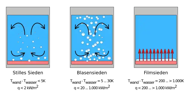 In Abhängigkeit von der Wärmestromdichte, die der siedenden Flüssigkeit über eine Heizfläche zugeführt wird, bilden sich unterschiedliche Formen des Siedens.
