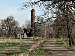 Der Schornstein des Dampfmaschinenhauses zur Wasserversorgung des Schlossparks Babelsberg wurde ebenfalls im neugotischen Stil mit Blendfenstern und Zinnen errichtet.