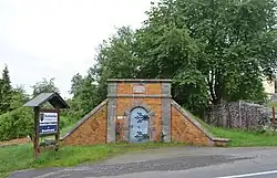 Der Zugang ist als rundbogiges Portal mit rahmenden Lisenen aus Werkstein gestaltet. Die alte Tür hat schmiedeeiserne Beschläge aus der Erbauungszeit. Das Mauerwerk ist mit glasierten Ziegeln verkleidet.
