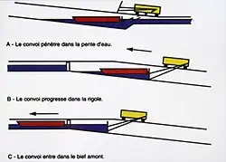 Wenn ein Schiff vom Unterwasser her ins Hebewerk einfährt, muss das ortsfeste untere Absperrtor geöffnet sein und das Wassertor des Hebefahrzeugs (am starren Verbindungsbalken des Triebfahrzeugpaars) sowie der Festmachbalken so weit angehoben sein, dass die lichte Durchfahrtshöhe für die (eventuell teilweise abgesenkten) Aufbauten des Schiffs ausreicht. Das Schiff (oder mehrere innerhalb einer begrenzten Länge) stoppt dann in der Rinne, der Festmachbalken wird hinter dem Schiff hydraulisch durch Rotation abgesenkt und taucht dann ein wenig ins Wasser. Das Schiff wird an diesem Balken, an dem eine Reihe Fender hängen, verzurrt. Zwei Backen, die nahe der Rinnenwand in senkrechten Achsen am Balken gelagert sind, können hydraulisch schräg gegen das Schiff gedrückt werden, um die Verzurrung zu spannen und das Schiff klar Rinnenwände auszurichten, damit es bei der Hebefahrt nicht anstreift.