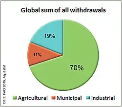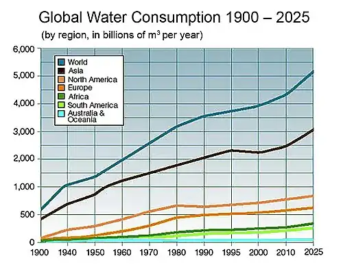 Wasserknappheit als Resultat von Übernutzung wird vor allem durch die Landwirtschaft und hier vor allem durch die Viehzucht verursacht, aber auch durch die Industrie. Menschen in Industrieländern verbrauchen circa zehnmal so viel Wasser wie Menschen in Entwicklungsländern.[12] Ein Großteil dieses Verbrauchs wird durch indirekten Wasserverbrauch, zum Beispiel in der landwirtschaftlichen oder industriellen Produktion von Konsumgütern verursacht. Durch die Globalisierung von Produktionsketten wird viel Wasser in Schwellen- und Entwicklungsländern verbraucht, um Güter zu produzieren, die in Industrieländern verbraucht werden.