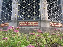 „Brunnen, Wasser in Tonnen verkauft, und eine Leitung die Grube entlang, befriedigten nicht die Bedürfnisse der Stadt, und deshalb führte man 1571 durch Röhren frisches Quellwasser von Metelsdorf auf den Markt. Kriegsnoth wegen richtete man 1682 das Pumpwerk ein, welches Flusswasser aus dem Mühlengraben herbeibrachte und vereinigte beides Wasser nach der Belagerung von 1715. Des Behälters Schadhaftigkeit und Kleinheit wegen ist die alte Kunst bis auf den Grund niedergenommen und neu eingerichtet, vergrößert wieder erbaut worden im Jahre 1861. Möge durch des barmherzigen Gottes Gnade der Fleiß und die Treue der Vorsteher auf lange Zeit hin dies der Gesundheit, Reinlichkeit und öffentlichen Sicherheit gewidmete Werk unserer Stadt erhalten.“