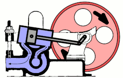 Der Schweizer Maschineningenieur Albert Schmid aus Zürich entwickelte in den 1870er Jahren einen kleinen Wassermotor,[2] der ähnlich einer Dampfmaschine arbeitete. Ein Kolben in einem Zylinder wurde wechselseitig mit Druckwasser beaufschlagt, so dass sich dieser im Zylinder hin- und herbewegte, eine Kurbelwelle wandelte diese Bewegung in eine Drehbewegung um. Ein Schwungrad sorgte für einen gleichmäßigen Rundlauf der Maschine. Die Steuerung des Durchflusses wurde dadurch bewerkstelligt, dass der Kurbeltrieb ohne Kreuzkopf ausgeführt wurde, die Kolbenstange wirkte direkt auf die Kurbel und der Zylinder oszillierte. Diese Schwenkbewegung des Zylinders gab abwechselnd die Ein- und Auslasskanäle frei. Um in der Phase, in der kurzzeitig beide Einlasskanäle verschlossen waren, die dabei entstehenden Druckspitzen des Wassers aufzufangen, wurde bei dem Motor ein Windkessel angebracht. Eine einfache Vorrichtung ermöglichte durch Anheben oder Absenken der Rotationsachse des Kolbens, den Dichtspalt zwischen dem feststehenden und dem sich bewegenden Teil genau einzustellen, so dass sich die Kontaktflächen nicht berührten, aber auch nicht zu viel Leckwasser austrat.[3]