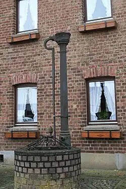 Die gusseiserne Wasserpumpe, eine Hubkolbenpumpe, stammt aus dem 19. Jahrhundert. Die Ausgussröhre hatte ursprünglich die Form eines Löwenkopfes mit kanneliertem Schaft. Sie ist nicht mehr vorhanden.