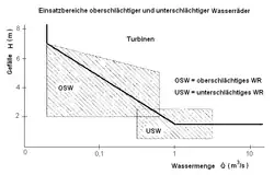 Im Gegensatz zur Wasserturbine benötigt ein oberschlächtiges Wasserrad keinen Rechen, um Treibgut herauszufiltern, und der Wirkungsgrad ist weniger abhängig von Schwankungen der Wassermenge. Das Einsatzgebiet liegt bei Gefällen von 2,5 m bis 10 m und Wassermengen bis zu 2 m³/s (typisch sind Gefälle von 3 bis 6 m und Wassermengen von 0,1 bis 0,5 m³/s). Für Mühlen liegen die typischen Wasserradleistungen zwischen 2 und 10 kW. Oberschlächtige Wasserräder werden bei Umfangsgeschwindigkeiten von ca. 1,5 m/s betrieben.