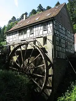 Bereits in römischer Zeit wurden Wasserräder auch für den Antrieb von Mahlmühlen genutzt. Der römische Baumeister und Ingenieur Vitruv beschreibt in seiner architectura aus dem 1. Jahrhundert v. Chr. sowohl das Prinzip des Wasserschöpfrads als auch das der -mühle ausführlich. Der früheste Nachweis einer Wassermühle in Deutschland gelang den Archäologen durch die Ausgrabung einer Mühle aus der Zeit um Christi Geburt an der Inde. Funde in der alemannischen Siedlung Mittelhofen bei Lauchheim datieren aus dem 6. Jahrhundert. Bereits im 9. Jahrhundert gab es viele Mühlen in Zentralfrankreich. Seit dem 12. Jahrhundert waren Wassermühlen in Mitteleuropa verbreitet. Später kam die Nutzung von Ölmühlen, Walkmühlen, Sägemühlen, Hammerwerken, Papiermühlen und Schleifmühlen hinzu. Der beginnenden Industrialisierung diente das Wasserrad zum Antreiben von Maschinen über die ersten Transmissionen. Auch im Bergwesen wurden sie zum Materialtransport und zur Entwässerung eingesetzt. So wurde im Oberharzer Bergbau mit Beginn des 16. Jahrhunderts der durch die Pest von 1348 zum Erliegen gekommene Bergbau auf Blei, Kupfer und Silber wieder aufgenommen. Im Jahr 1868 veröffentlichte Alfred Dumreicher eine detaillierte Beschreibung des Oberharzer Wasserkraft-Systems.[4] Er zählt darin 190 Wasserräder in der Größe von 6 Fuß (= 1,7 m) bis 40 Fuß (= 11,5 m) Durchmesser auf. Dazu kommen noch drei – für die damalige Zeit ganz moderne – Wassersäulenmaschinen hinzu. 18 Wasserräder haben einen Durchmesser von mehr als 10 Metern und 10 Wasserräder mit 11 Meter Durchmesser und mehr. Dumreicher beziffert die in diesem Wasserkraftsystem erbrachte Leistung auf 1870 Pferdekräfte netto. Dabei wurde hier die Wasserkraft für die besonderen Anforderungen im Erz-Bergbau eingesetzt. Eine der wichtigsten Aufgaben war die Förderung des Erzes von dem unter Tage liegenden Abbaustollen über Höhen von teilweise mehr als 500 Meter zu Tage. Ein mit Erz gefüllter Förderkorb hatte damals ein Gewicht von 300–350 Kilogramm. Weitere Aufgaben waren die Beförderung der Bergleute mit Hilfe der Fahrkunst und das Herausheben des in die Gruben eingesickerten Wassers in Form der bergmännisch genutzten Wasserkunst.
