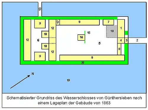 - Ab 1691 wurde die Wasserburg unter Heinrich Bonhorst (1643–1711), der unter anderem auch die Güntherslebener Kirche St. Petri neu erbauen ließ, durch eine große Schlossanlage mit bastionsartig vorspringenden Ecken ersetzt, umgeben von einem breiten wassergefüllten Graben. Die Familie von Bonhorst mit ihren Erben besaßen das Schloss bis 1737.