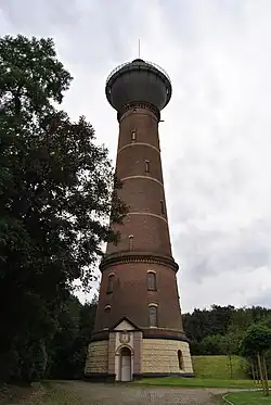 Auf dem höchsten Punkt der Umgebung mit 36 Meter über Normalnull erhebt sich der 50 Meter hohe Turm. Im Kopf ruht der genormte Kugelbehälter der Firma Klönne mit einem Durchmesser von 9,20 Metern und einem Fassungsvermögen von mehr als ca. 400 Kubikmetern auf Auflagern. Darunter steht ein Turm mit 12 Meter Breite am Boden und circa 6 Metern Breite in Höhe des Aufliegerringes. Das Erdgeschoss ist als Sockel in Quadermauerwerk, der Turm mit sieben Geschossen als Ziegelmauerwerk mit Verzierungen und Fenstern in unterschiedlicher Höhe und Größe ausgeführt. Im Inneren befindet sich das Treppenhaus, durch die Kugel führt eine Röhre mit Leitersprossen bis zur Laterne.[1]