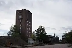 Der Wasserturm wurde wohl zwischen 1935 und 1940 errichtet. Der Stahlbetonbau hat neun Geschosse auf einem rechteckigen Grundriss. Der Turm ist mit roten Klinkern verkleidet und hat ein Flachdach. Die Ecken werden durch flache Lisenen betont. In den unteren sieben Geschossen befinden sich Büroräume, während die beiden oberen Geschosse für den Wasserbehälter vorgesehen waren. Ursprünglich diente der Turm dazu, die Dampflokomotiven mit Wasser zu versorgen.