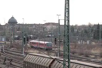 Blick auf den Wasserturm; im Vordergrund das Gleisvorfeld und Reste des ehemaligen Bahnbetriebswerks