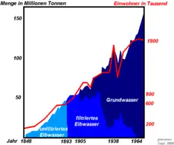 In den etwa 50 Jahren nach der Entstehung der Wasserver- und -entsorgung ab 1843 bis zur nächsten großen Hygienekatastrophe Hamburgs 1892 hatte sich die Bevölkerung Hamburgs, insbesondere auch wegen der flächenmäßigen Ausbreitung der Großstadt, von etwa 190.000 auf etwa 620.000 Einwohner verdreifacht.[17] Dieser Umstand brachte eine erhebliche Verschlechterung der Trinkwasserqualität mit sich.