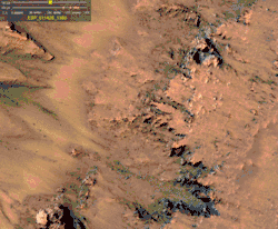 Während des Sommers auf der Mars-Südhalbkugel entstehen an sonnenexponierten Hängen recurring slope lineae. Sie deuten vermutlich auf salziges Flüssigwasser hin, das nahe der Oberfläche unterirdisch zu Tal fließt.
