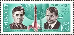 Briefmarke der Mission Sojus 12 mit Lasarew (links) und Oleg Grigorjewitsch Makarow (rechts)