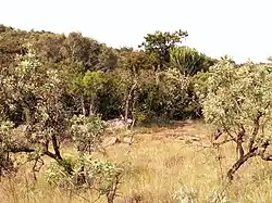 Die Savanne besteht, neben dem Savannentyp selbst,[15] im Wesentlichen aus Grasland,[16] Fynbos[17] und teils aus Laubwald.[18] An Bäumen und Baumartigen herrschen Bergflieder, Myrobalanen (Combretum erythrophyllum sowie Terminalia sericea) und Lavendel-Bäume vor. In den trockenen Wintern verlieren sie ihre Blätter. Zu den signifikanten Samenpflanzen gehören etliche Vertreter der artenreichen Kapflora; so Fynbos, wie Sauergrasgewächse, Kap-Schilf, Myrtenartige, Wanzenpflanzen, Silberbaum- und Heidekrautgewächse ((Ericaceae)) sowie Wolfsmilchgewächse, Süßgräser und Binsen. Diese bilden die Nahrungsgrundlage für Impalas, Kudus, Klippspringer und Streifengnus. Einige Pachypodien finden Lebensräume an den Füßen der Inselberge. Eine besondere Bedeutung hat die Gelbrinden-Akazie, von der die San annahmen, dass sie die Kommunikation mit den Ahnen erlaubte.