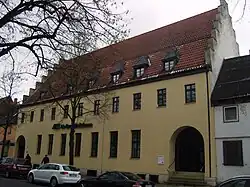 Auf dem Hof befindet sich ein Gebäude mit einem ungewöhnlichen halbrunden Erker, in dem sich das Treppenhaus befindet.